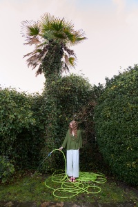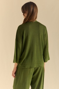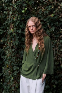 Linen knit kimono. Dropped sleeves and V-neck with a sheer panel and a loop to tie at the opposite side with a small wooden button. Tie at the inner hem. Wide tubular cuffs and hem.