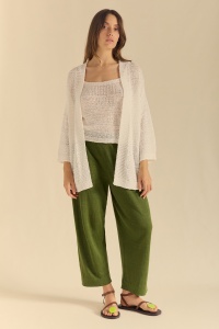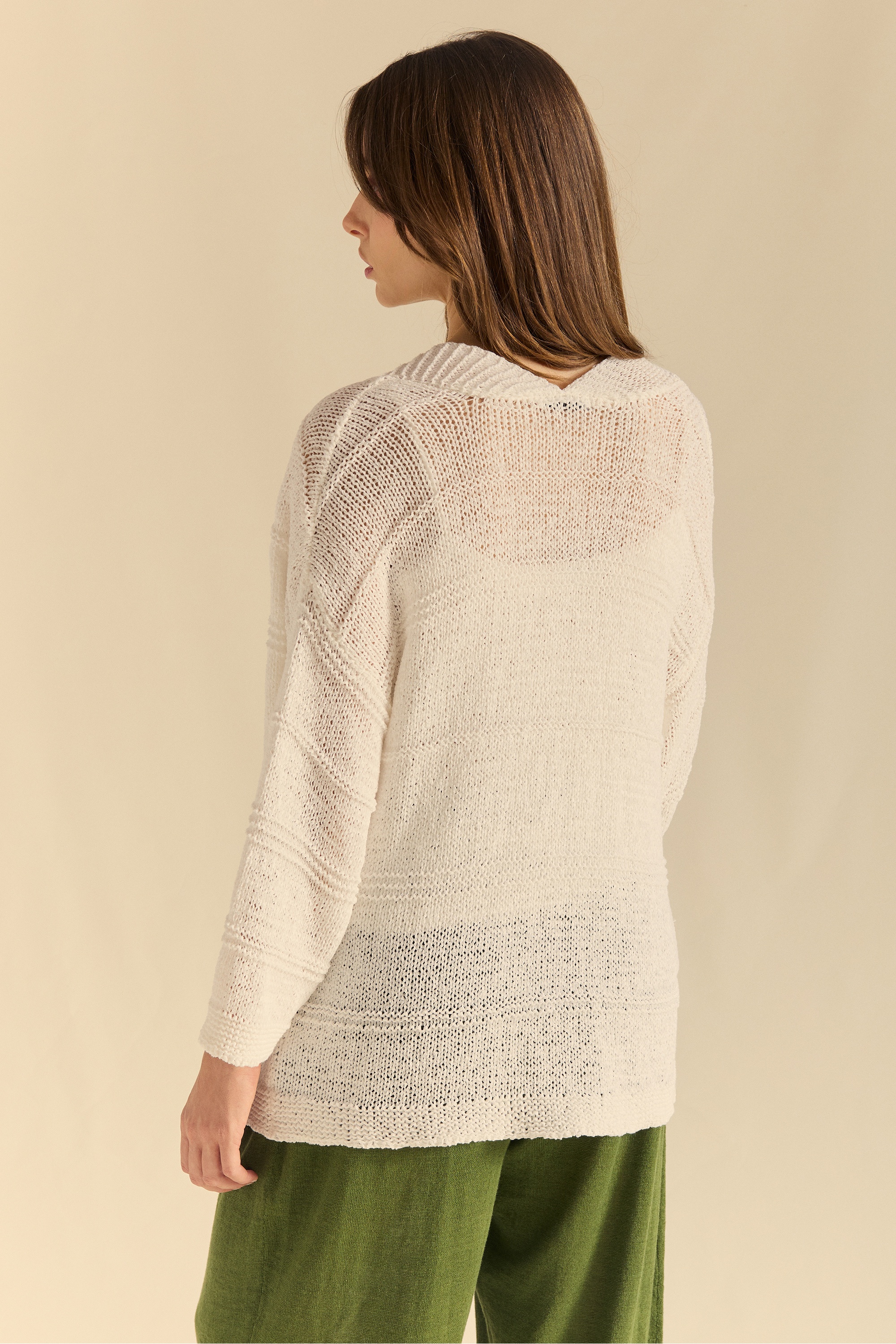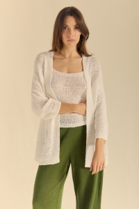 Plain knit cardigan with links detailing. Wide drop-sleeve pattern. Link detailing at the neckline, hem, and cuffs.