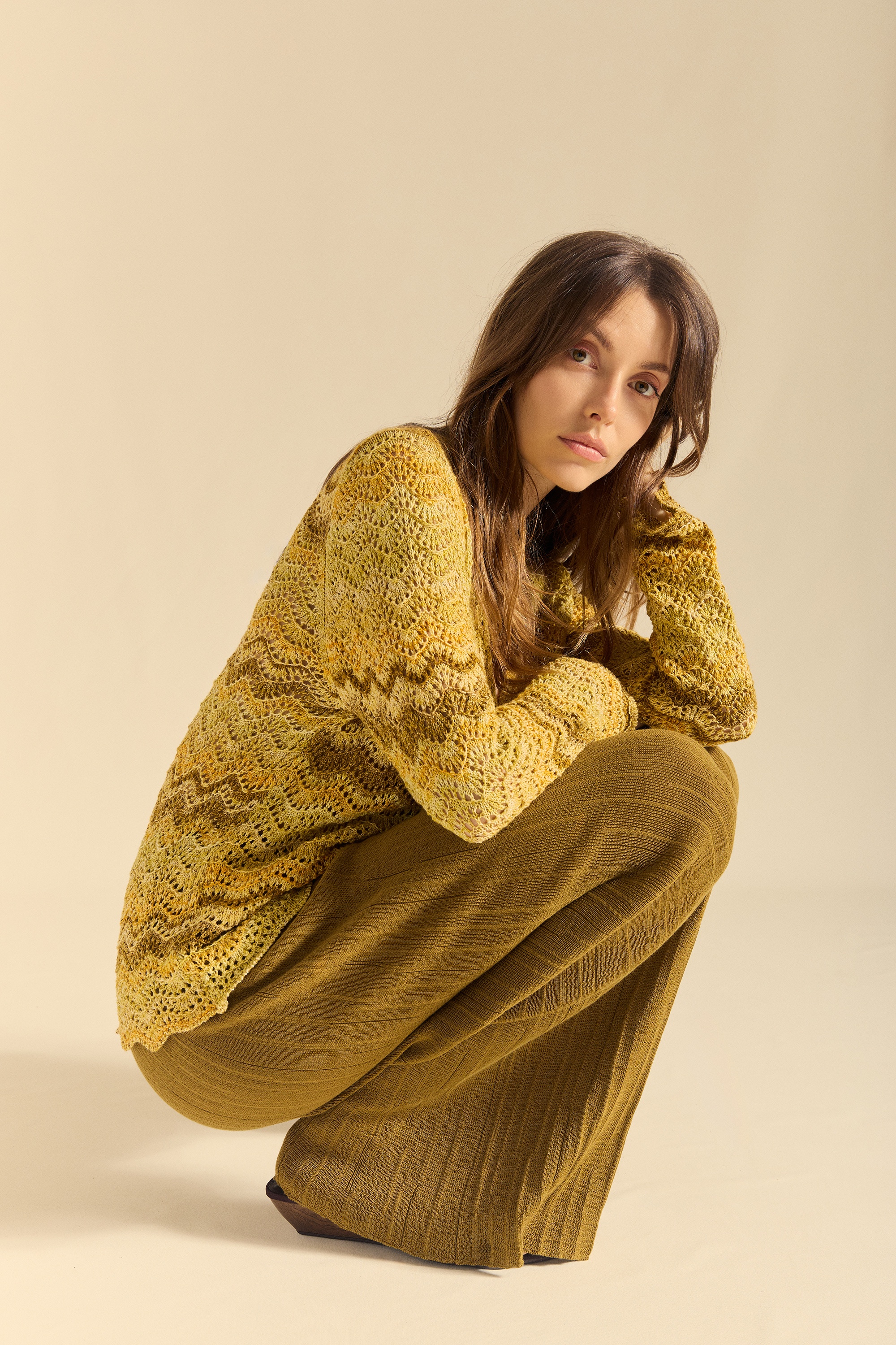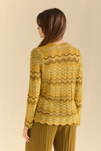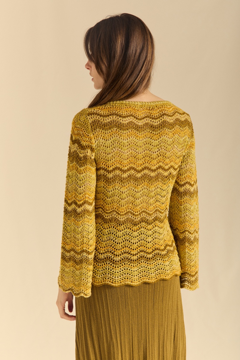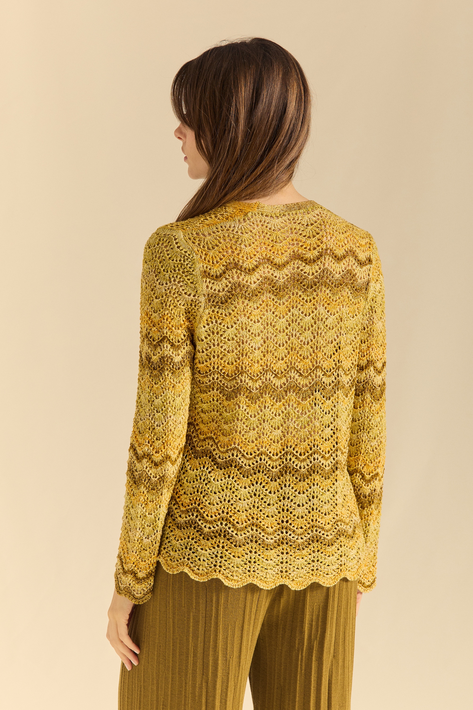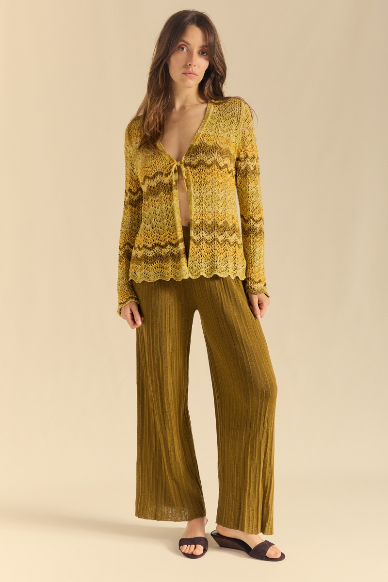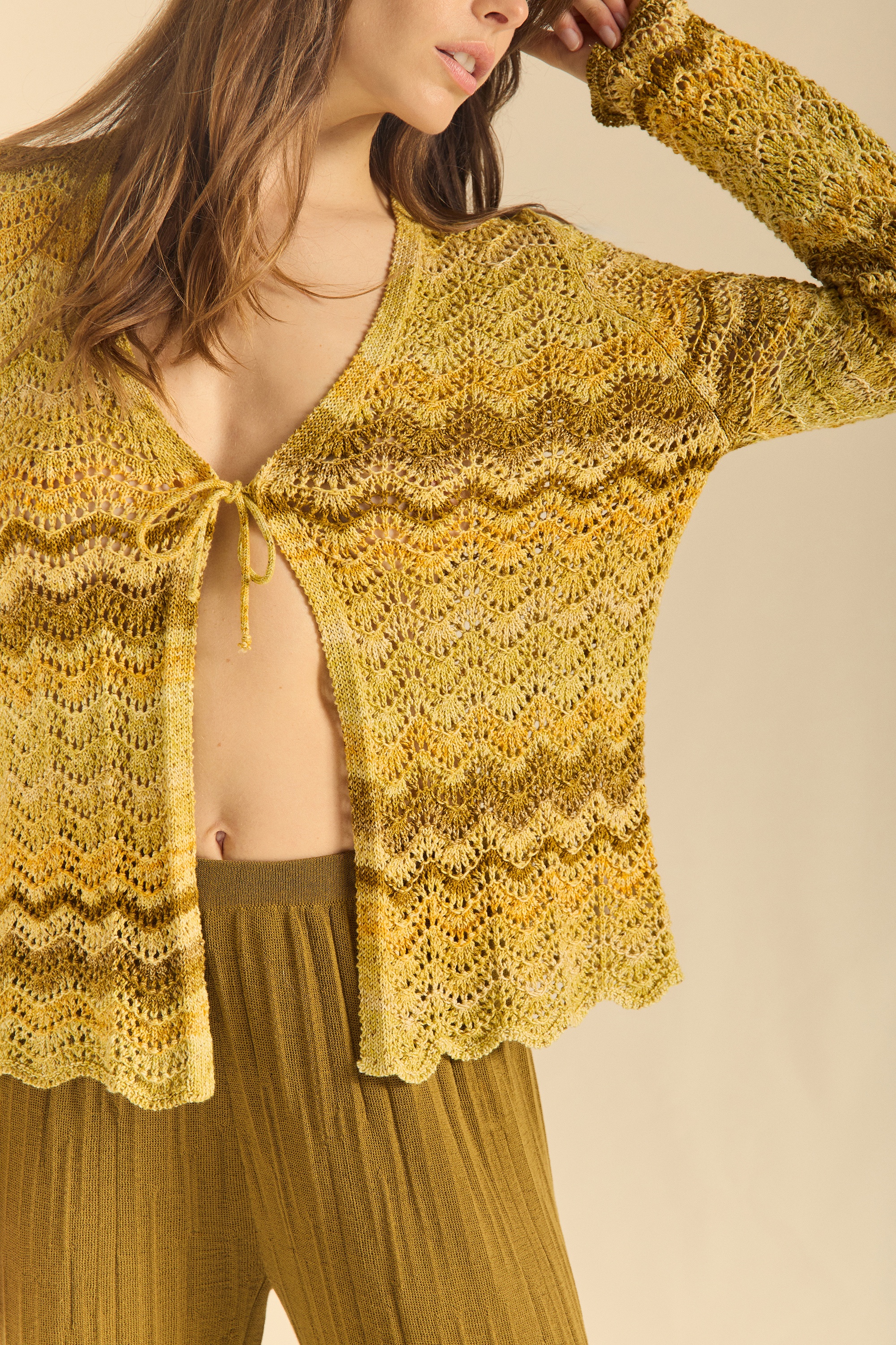 Cardigan with fitted flared sleeves. V-neck with tie closure at the front. Knit with a wave effect.