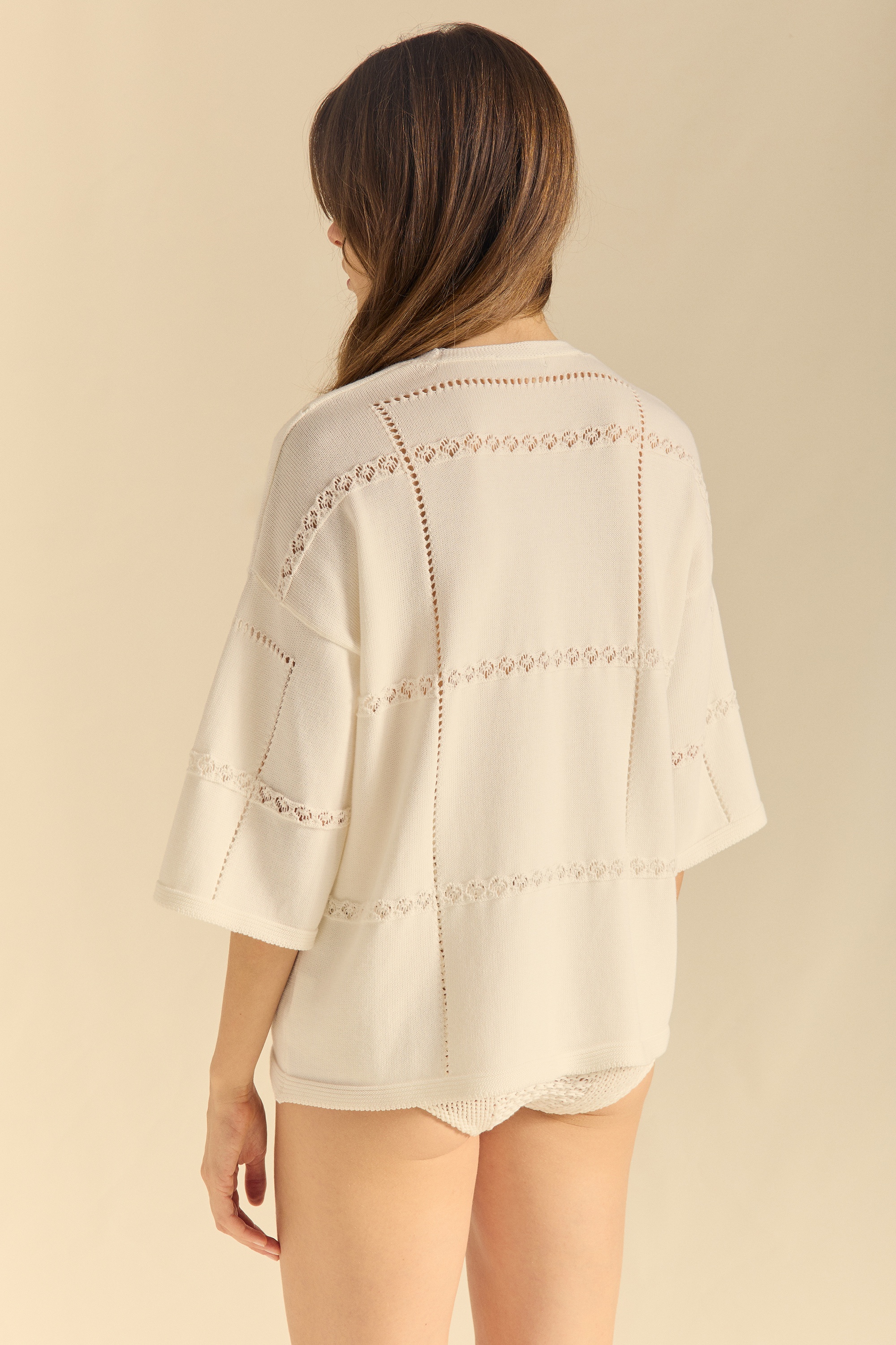 Drop-sleeve shirt with a tie at the center of the neckline. Plain knit combined with openwork and a polka dot pattern forming the shape of a moth on the left front chest.