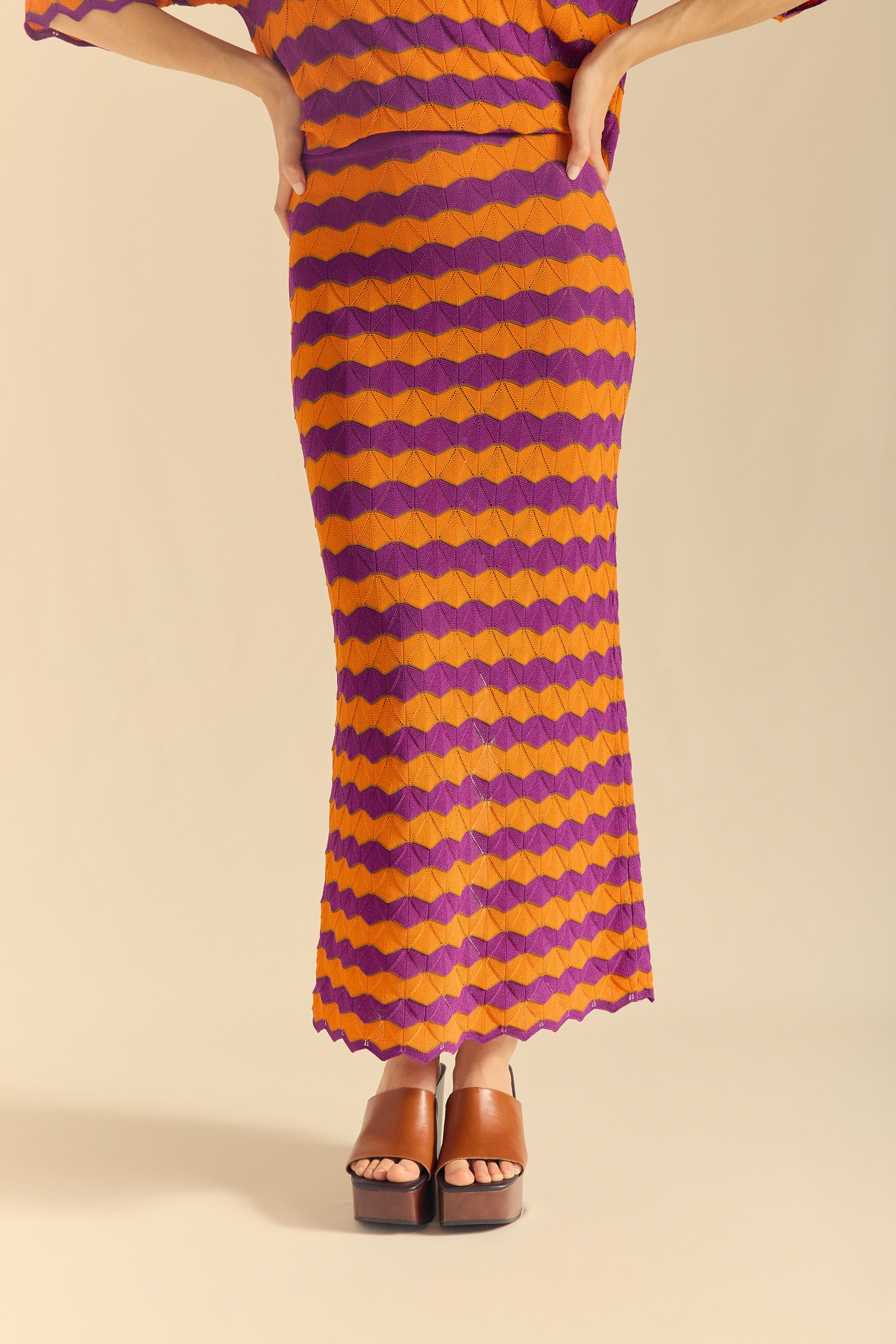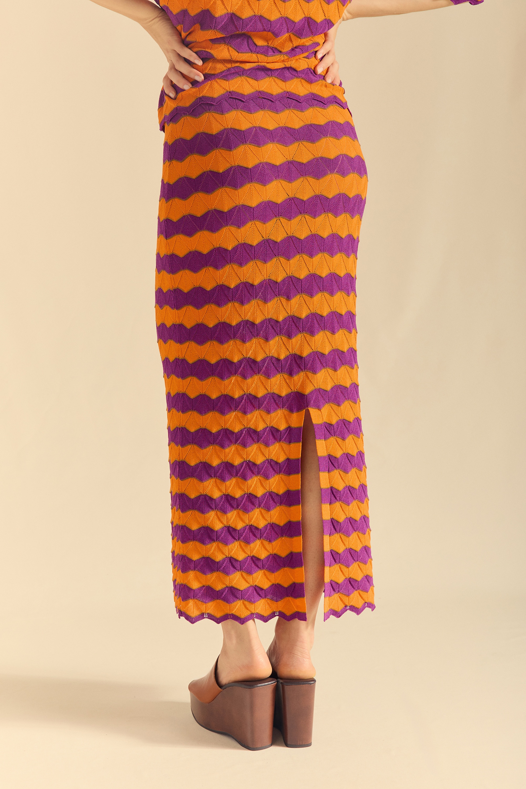 Knit skirt in three colors. Waistband with 2cm elastic. Hem and cuffs with a wavy shape following the pattern of the knit.