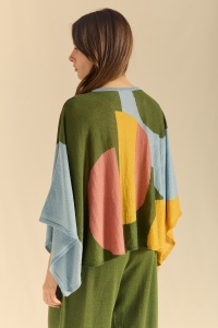 Jersey cape-style knit top in linen. Four-color intarsia combining geometric and organic shapes. Round neck in a tubular style. Engraved wooden buttons with logo at the hem to close the garment.