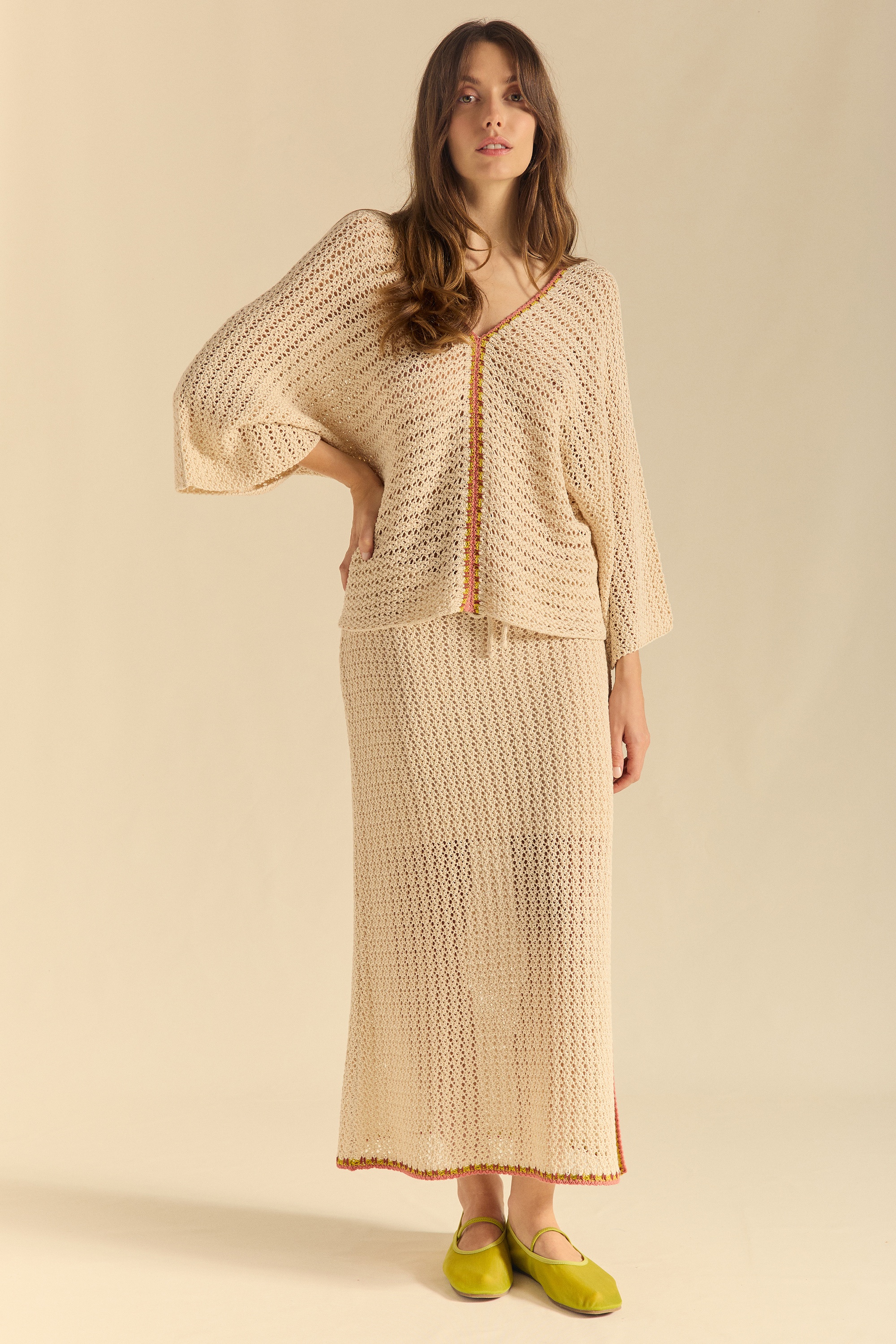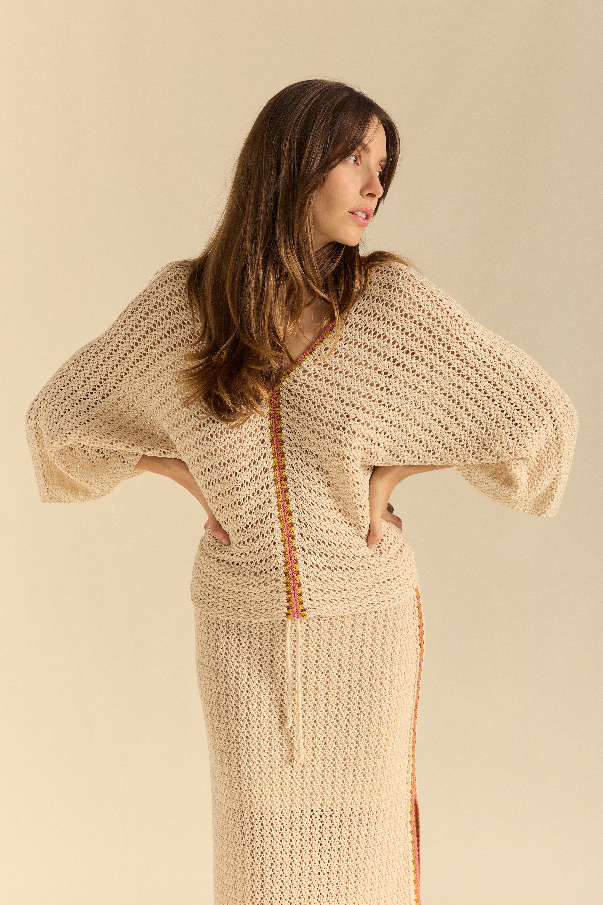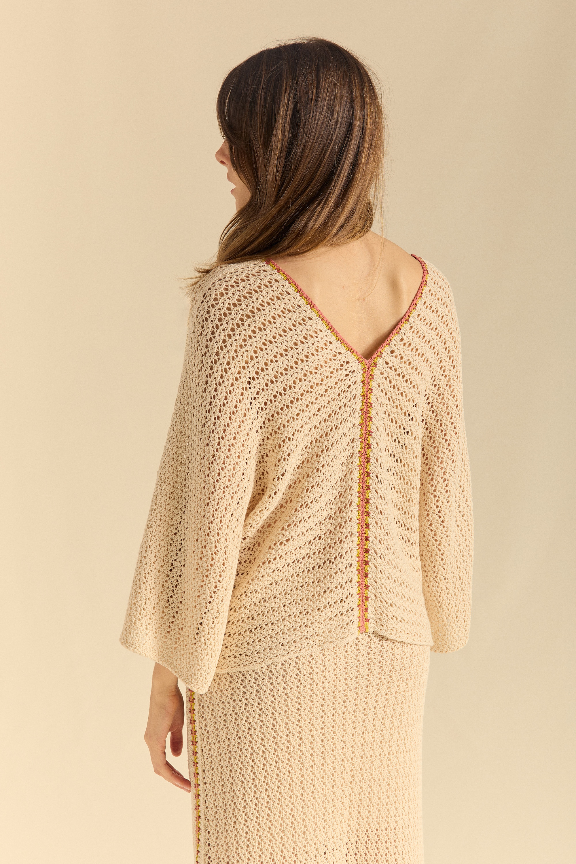 Fancy knit sweater with wide sleeves. Composed of two parts that join at the center of the front and back, creating a V-neckline complemented by the finished body, reminiscent of blanket seams, combining three contrasting colors with the background of the garment.
