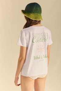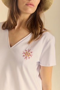 Fitted sleeve t-shirt with a rolled hem and collar. V-neck and side slits. Embroidered detail on the left chest. Textile lettering print on the back.
