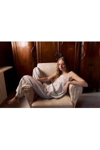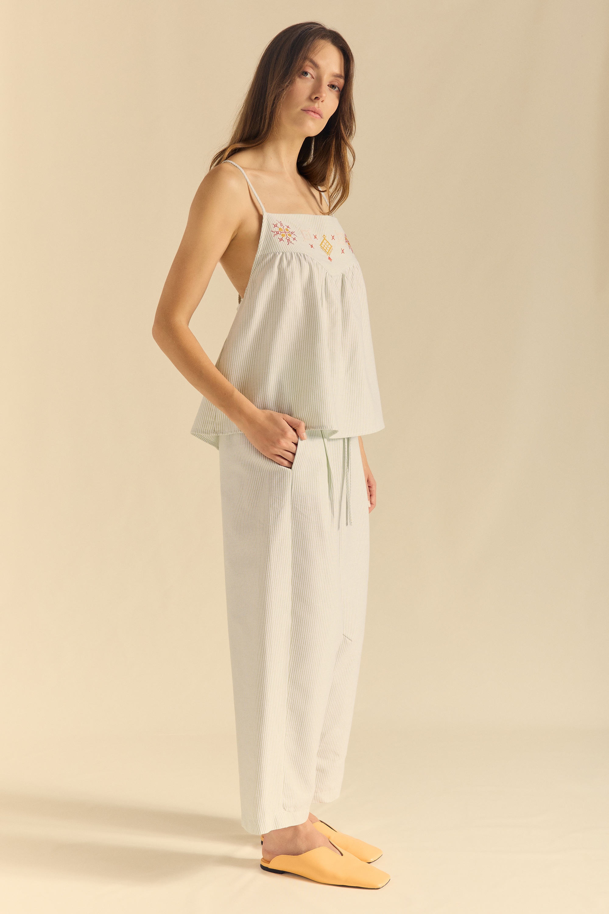 Top with a high yoke made from striped fabric. Adjustable straps at the wide back neckline. Ethnic embroidery detail along the front yoke.