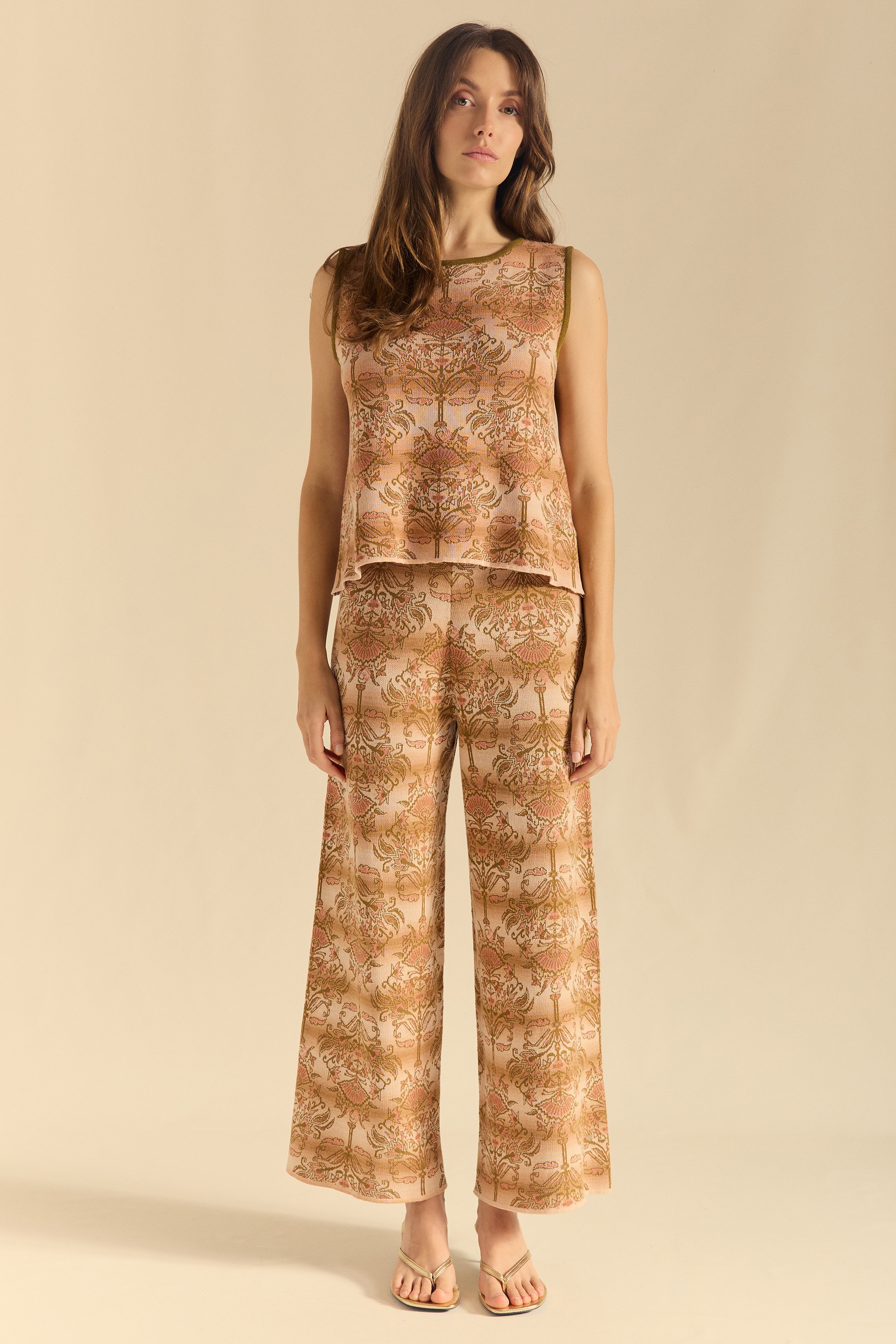 Sleeveless top with a round neck in a tubular knit. Jacquard fabric reminiscent of a paisley print, combining three strands of yarn, one of which is patterned, creating a gradient effect in the background.
