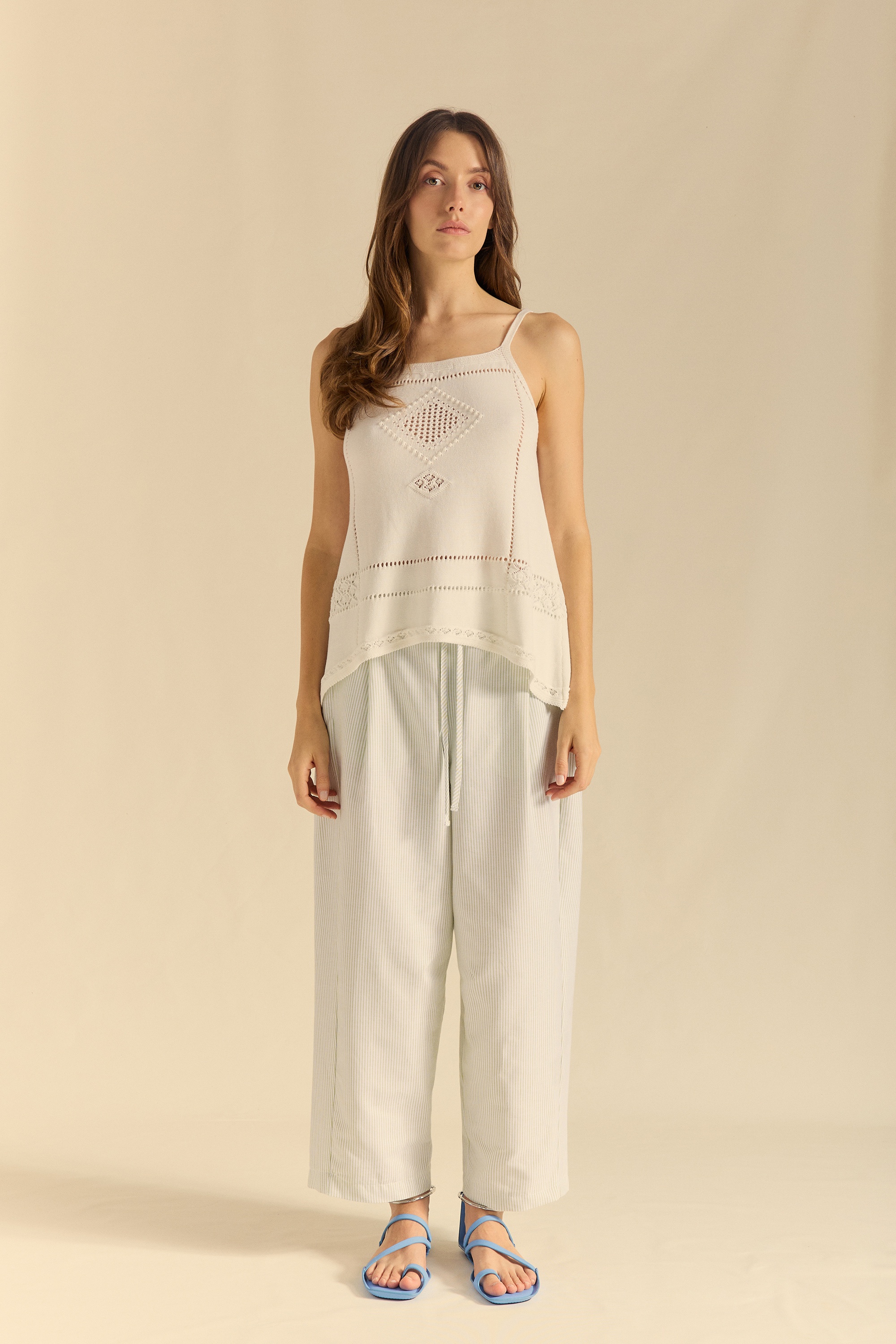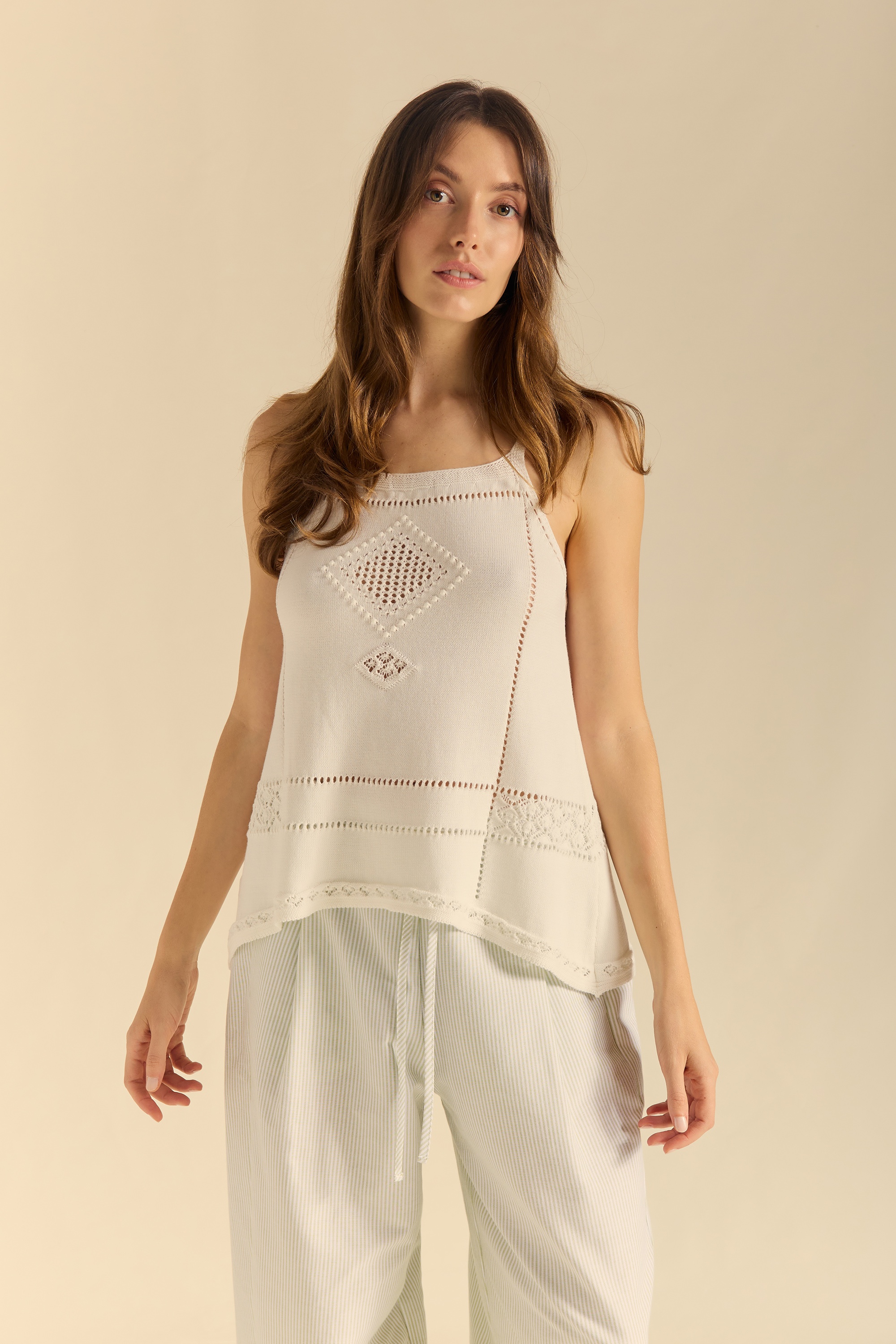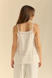 Sleeveless knit top with an A-line silhouette. Plain knit combined with openwork and a polka dot motif that forms the shape of a moth at the center of the back.