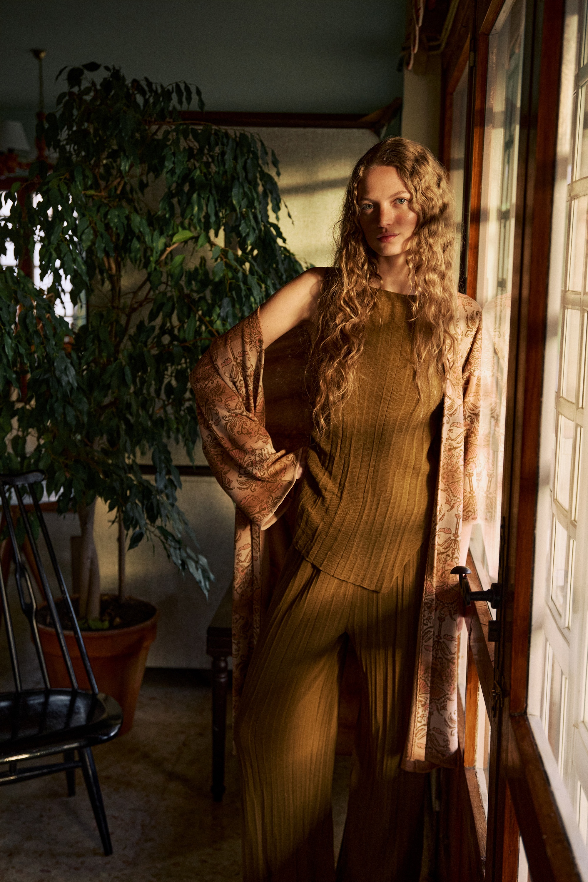 Combed cotton knit trousers with a crinkled effect. Tubular waistband with 2cm high elastic.