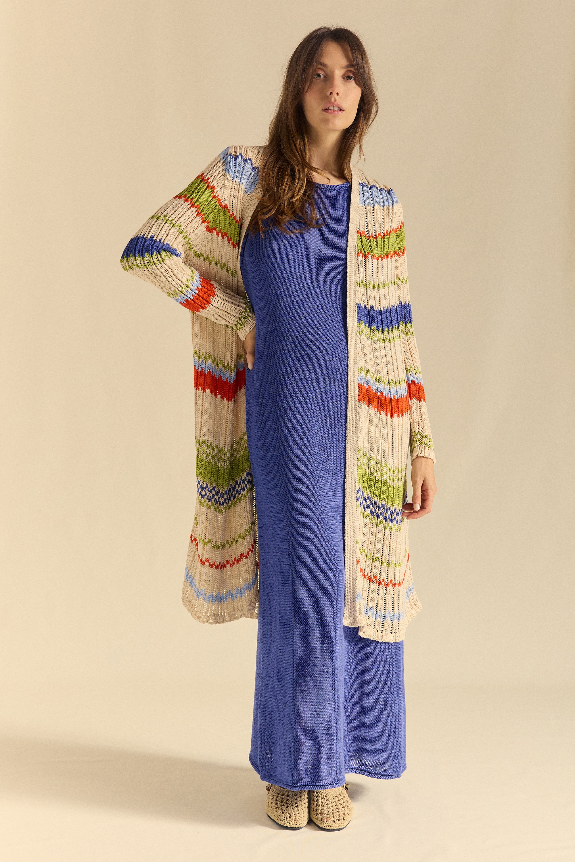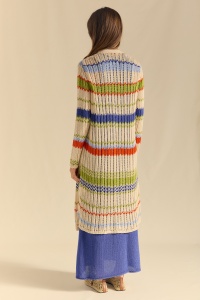 Long, needle-knit cardigan with colorful, nautical-inspired stripes. Tubular cuffs and hem.