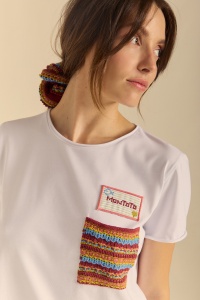 Camiseta circular de manga pegada con detalle de bolsillo de punto tricot, y etiqeuta de tela de montoto bordada