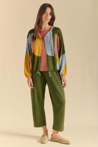 Chaqueta estilo bomber de punto en lino. Compuesta por intarsias de varios colores con motivos geométricos y orgánicos- Cuello y bajo en tubular con cordón para ceñir la prenda. Puños también en tubular con goma.