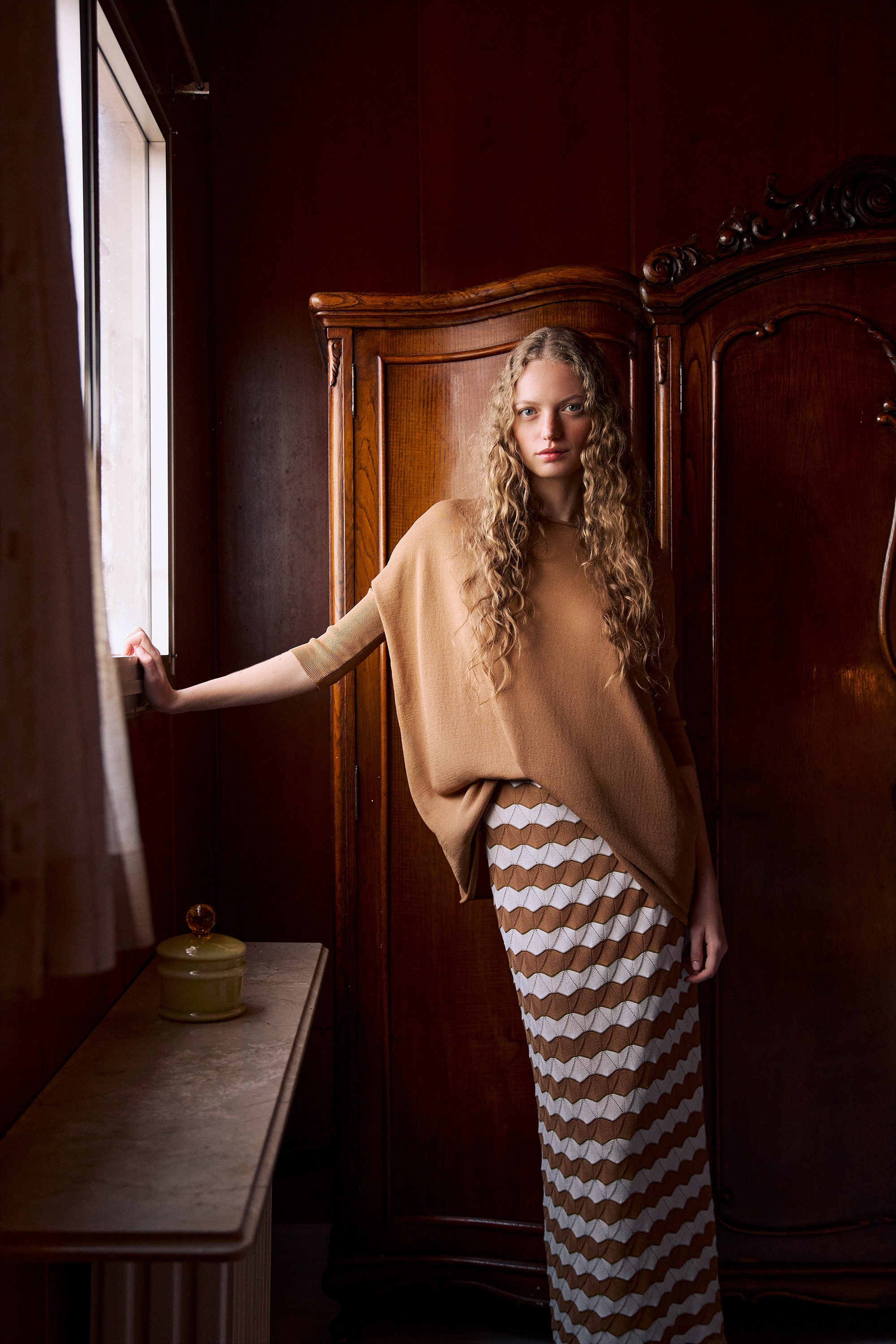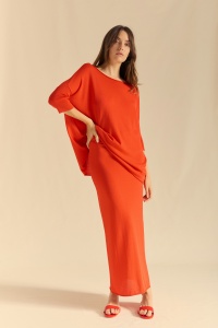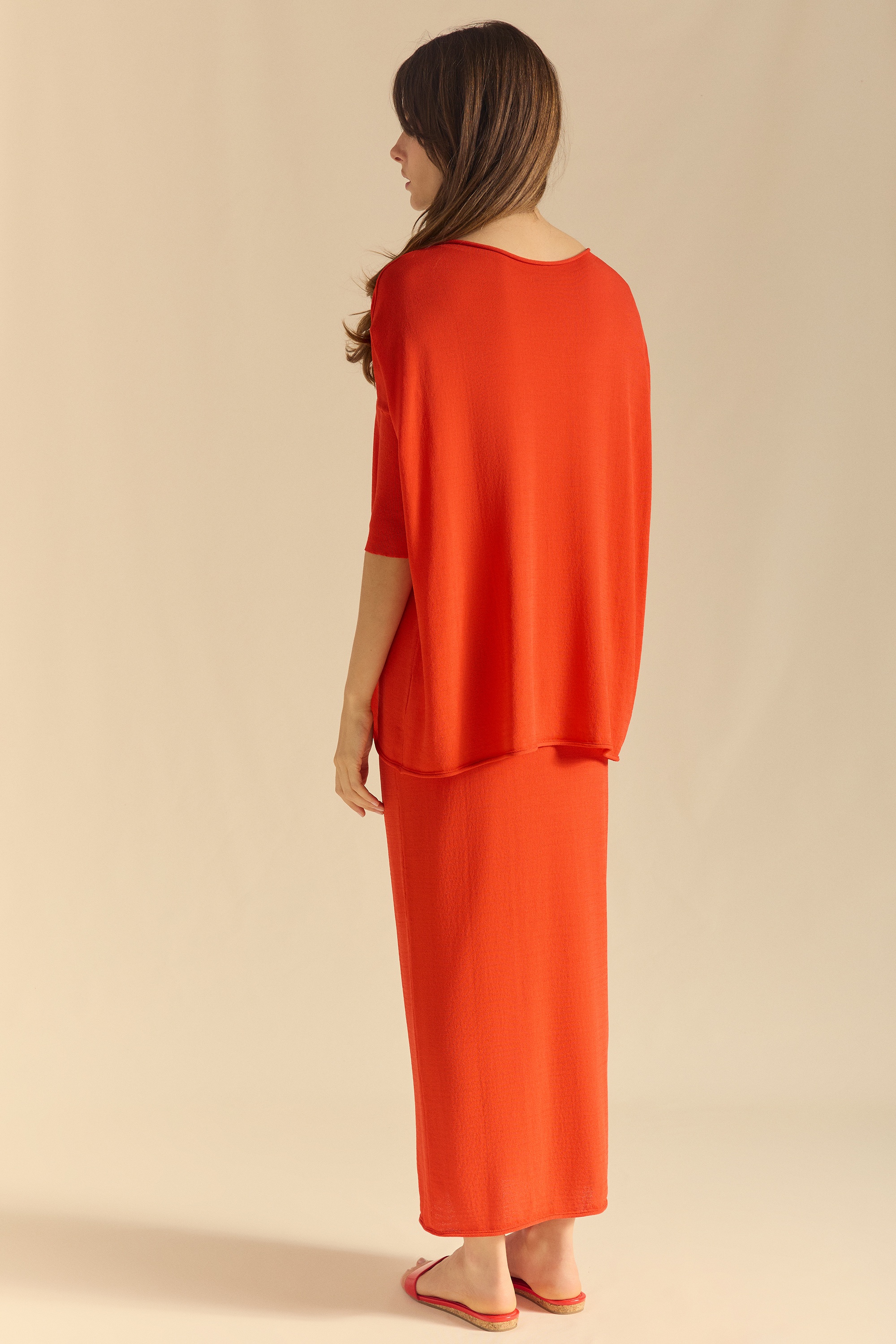 Jersey de punto de manga murciélago. Escote redondo amplio, en rulé, al igual que el bajo. Puños acanalados.