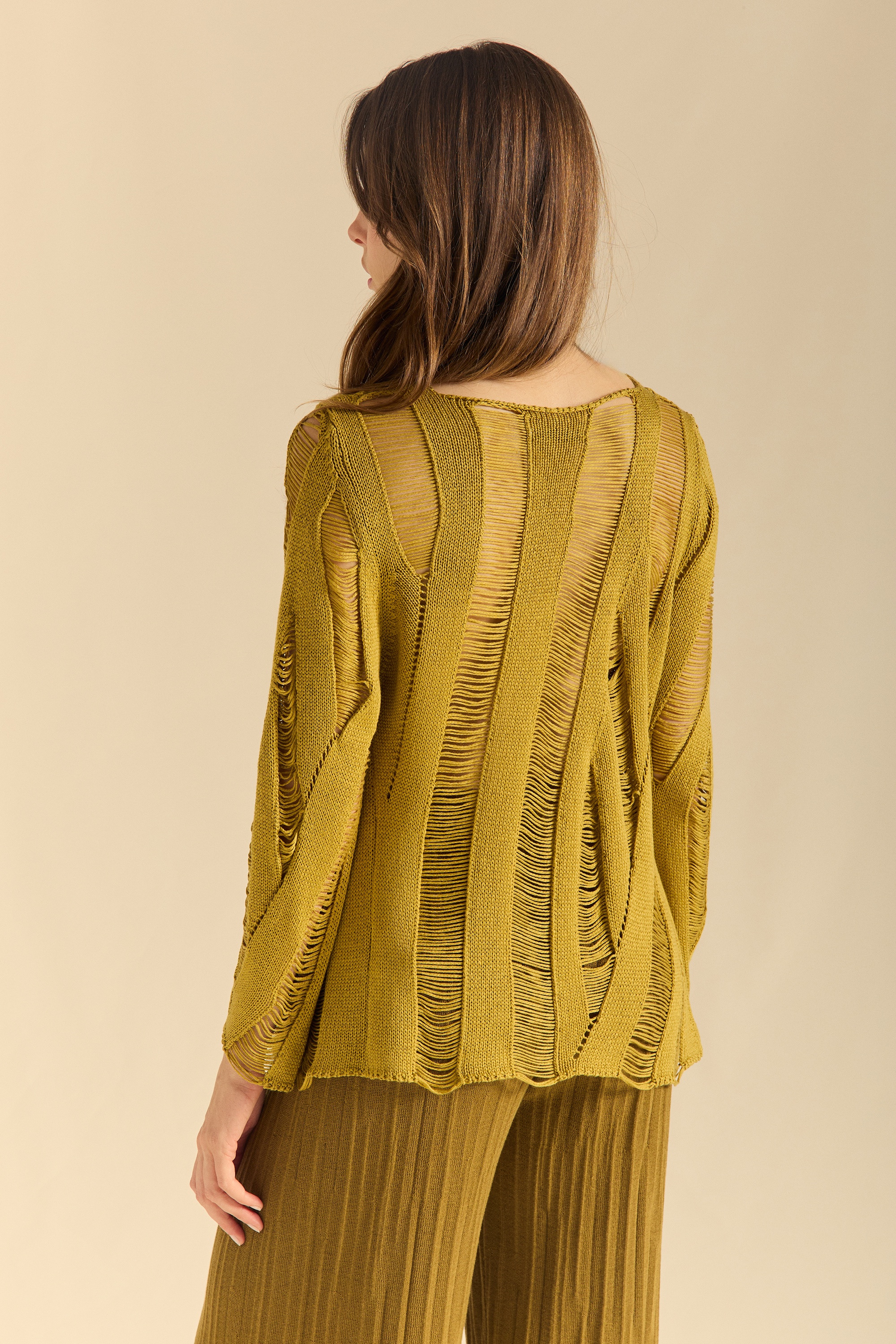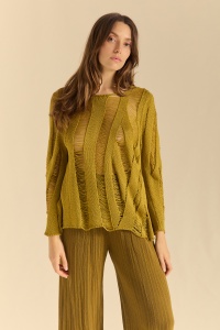 Jersey de punto de manga pegada con cuerpo desagujado que busca trazar el dibujo orgánico que recuerde a las ojas tropicales de las palmeras.