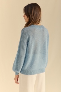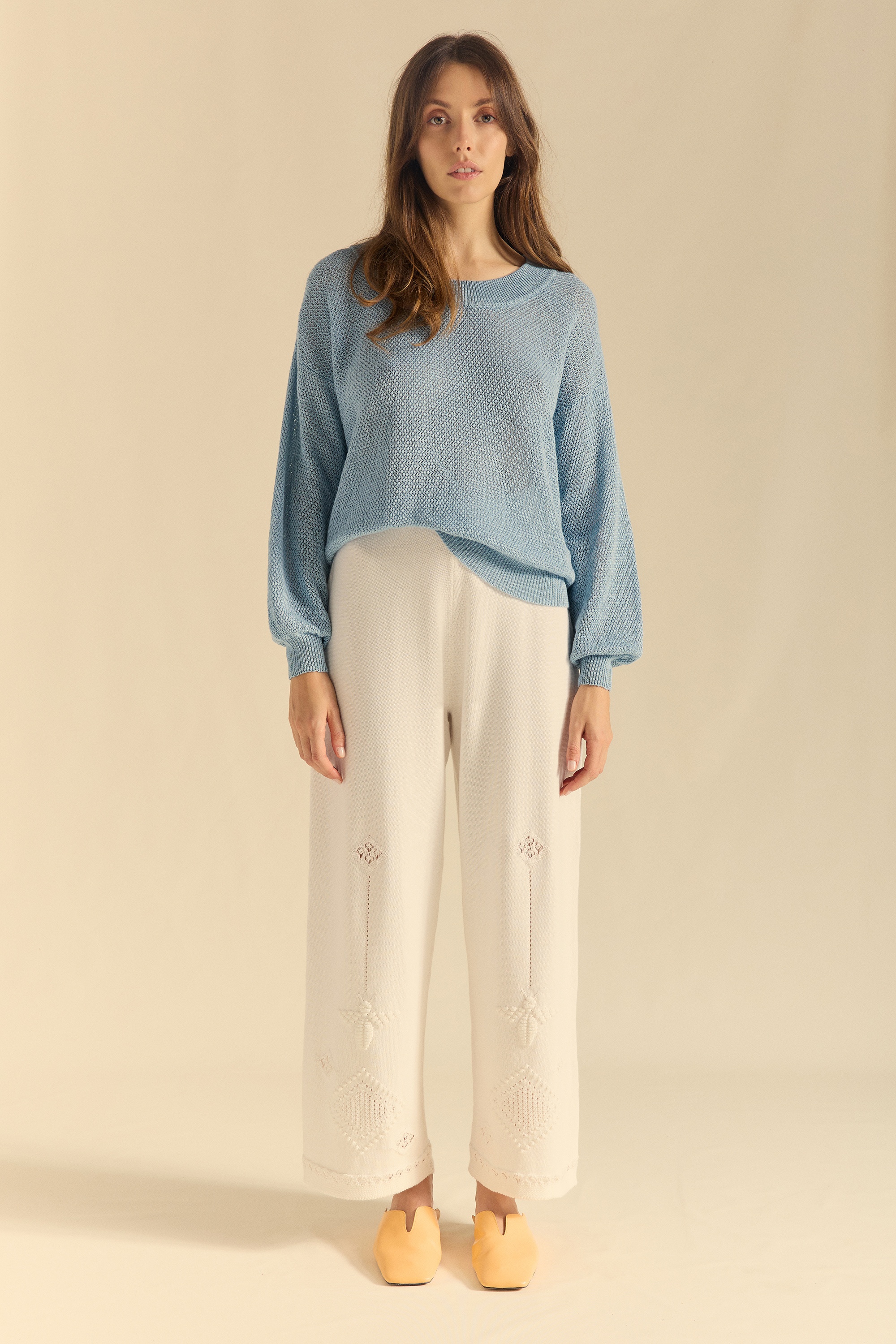 Jersey de lino en punto trabajado. Manga caída abullonada y cuello redondo acanalado amplio. Puños y bajos también en canalé.