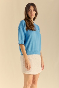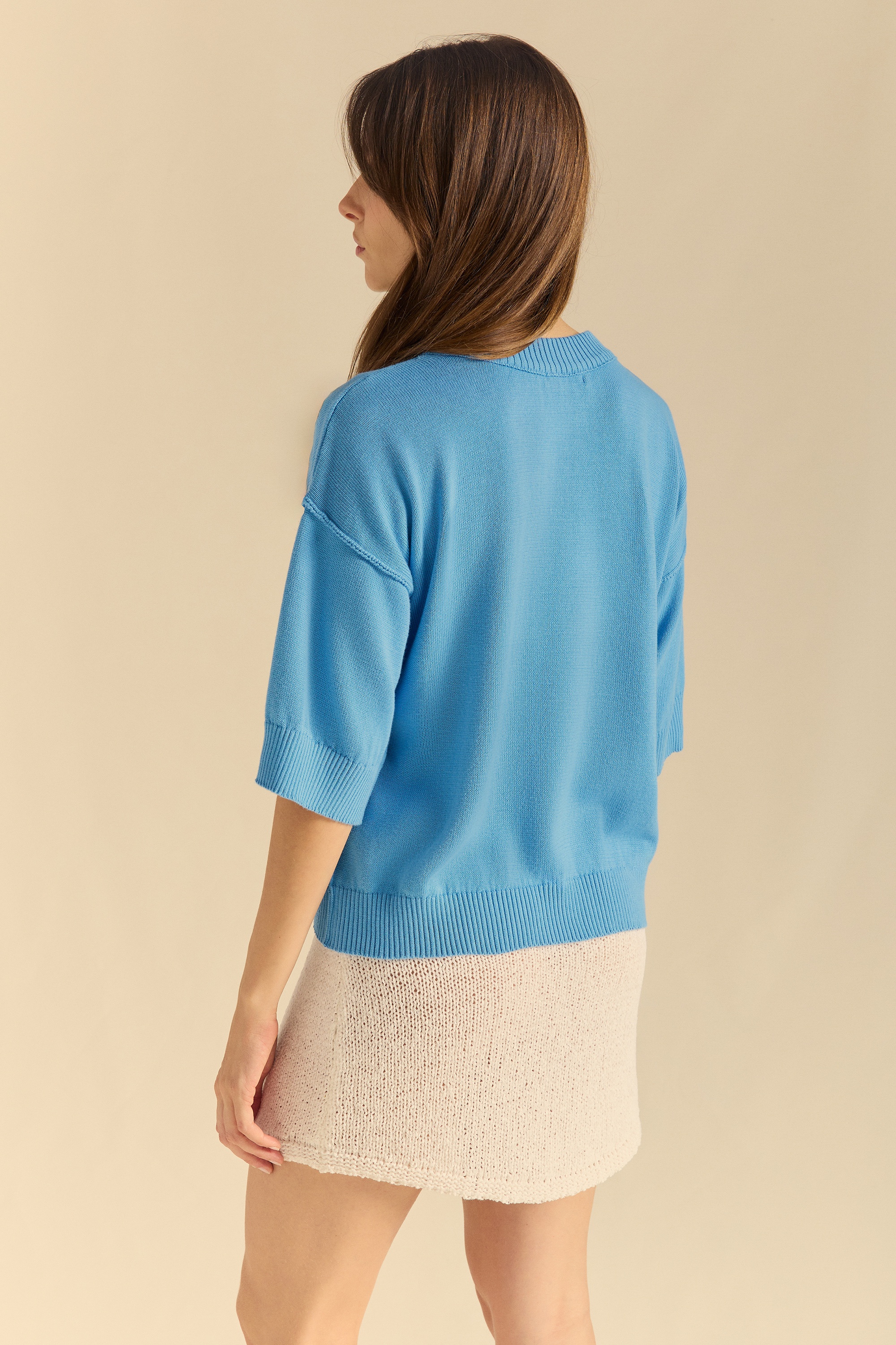 Jersey de algodón de manga corta caída. Cuello redondo acanalado. costuras de manga vistas. Bajos y puños también en canalé