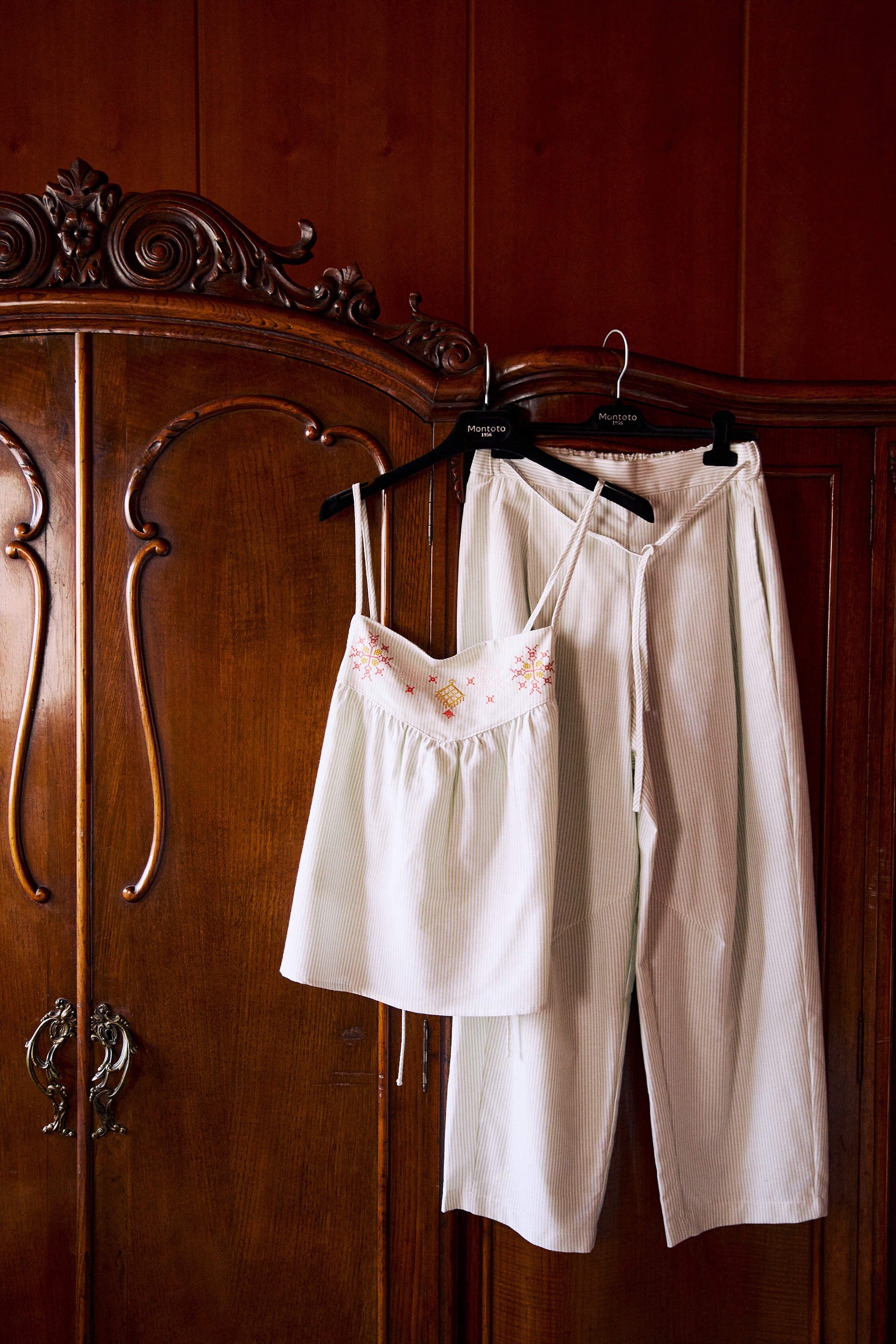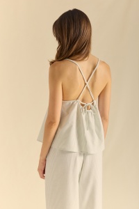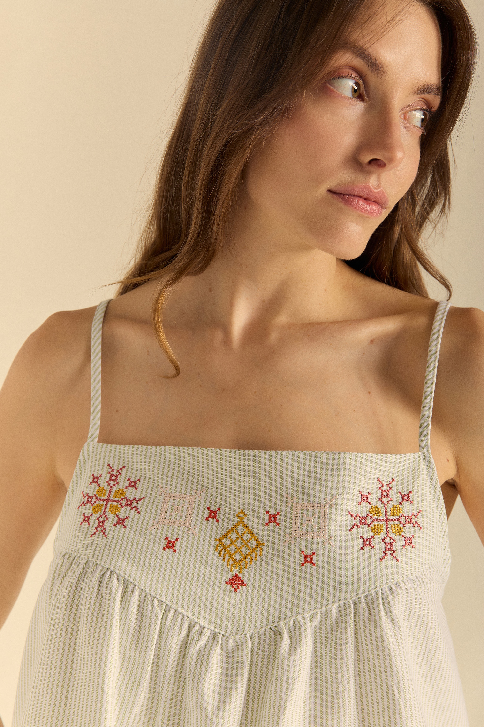 Top con canesú alto hecho en tejido de rayas. Tirantes ajustables en el amplio escote de la espalda. Detalle de bordado etnico a lo largo del canesú delantero.
