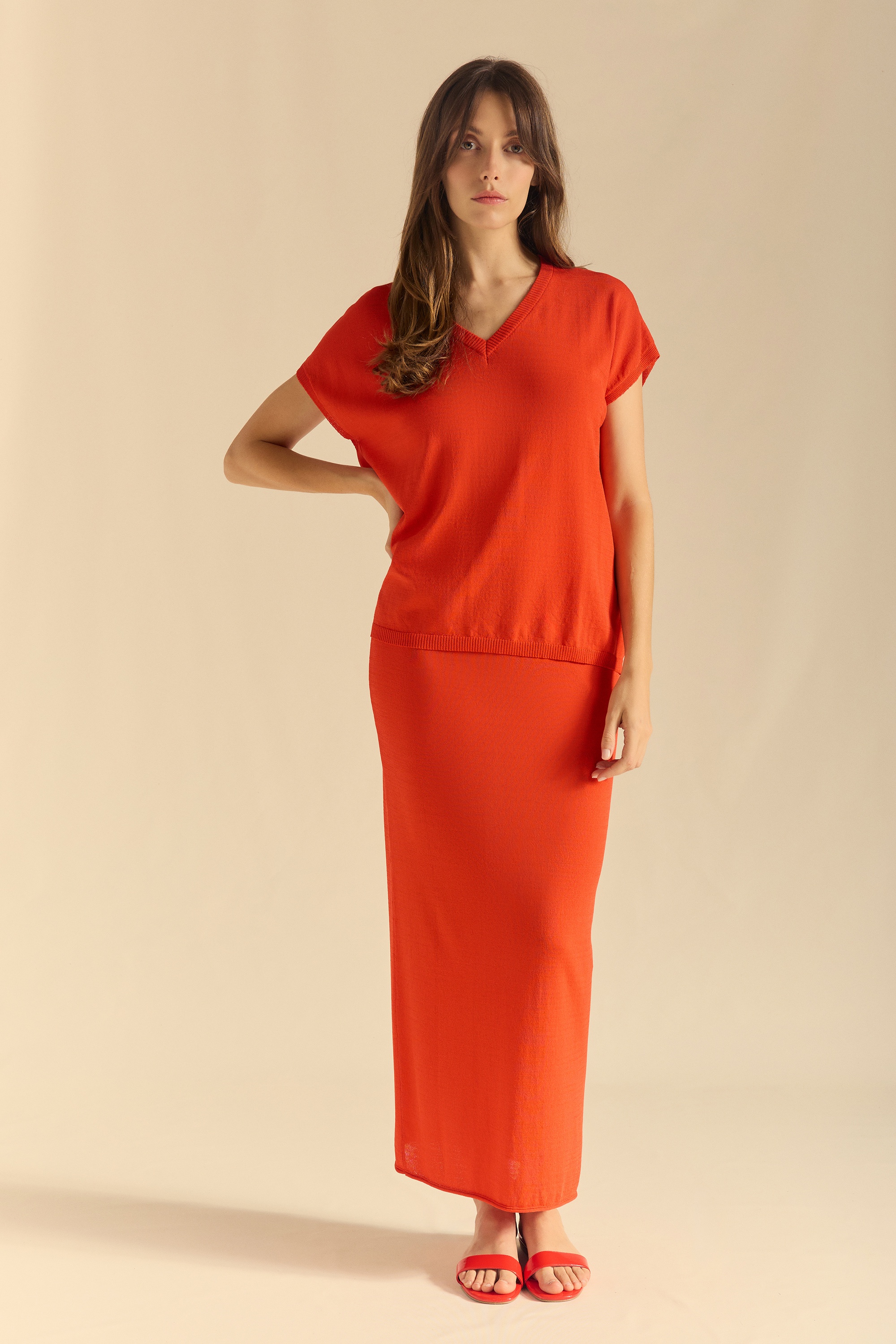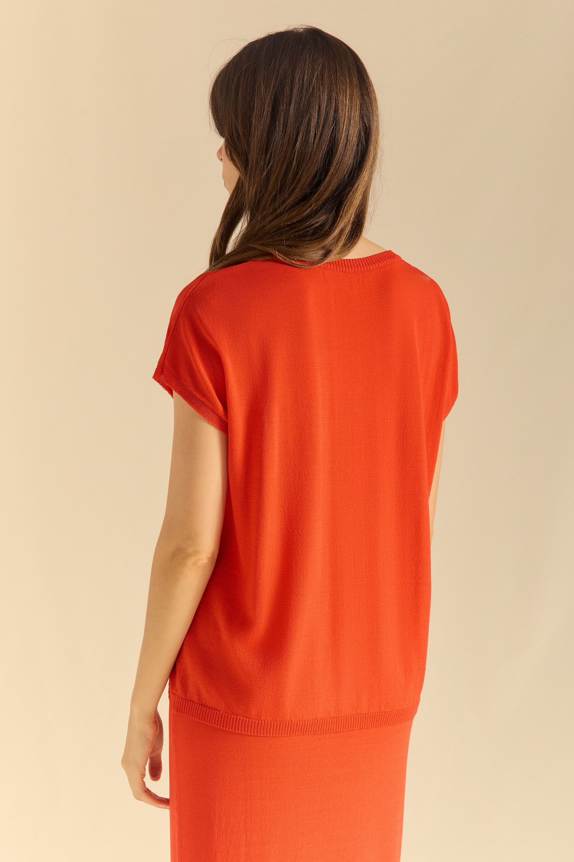 Top de punto liso de cuerpo amplio y hombro caído. Cuello pico y bajos acanalados.