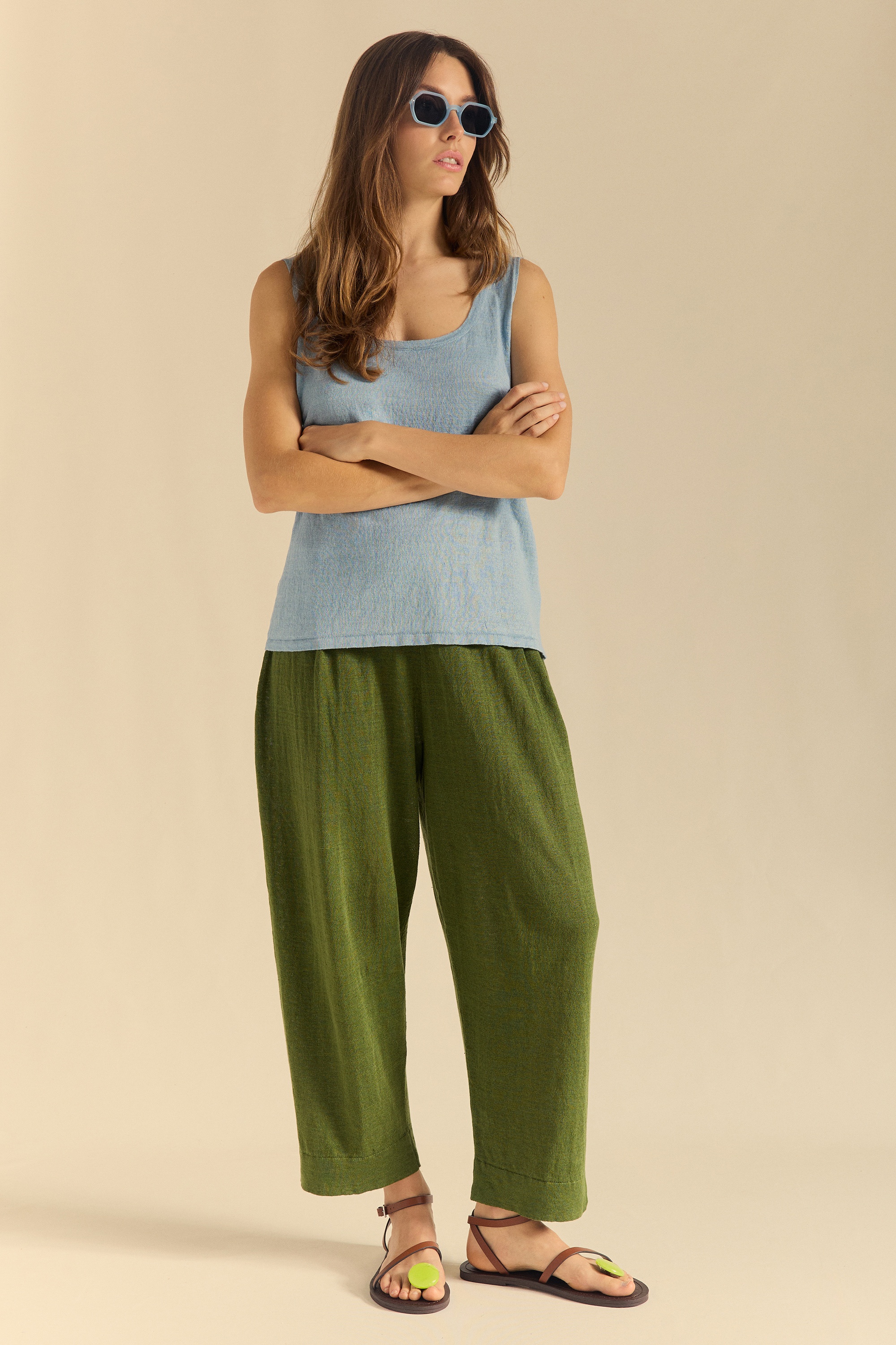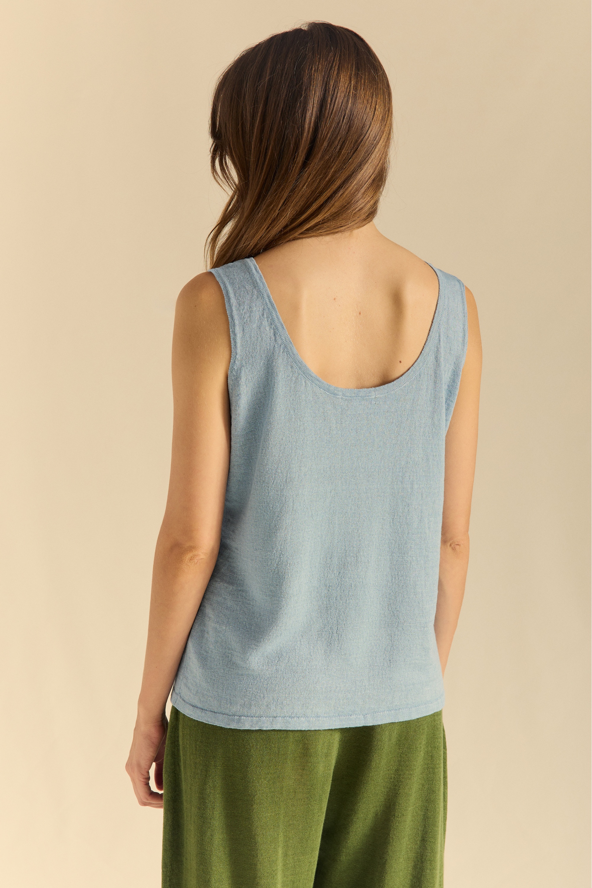 Top de lino con sisas de tirante ancho. Escote amplio redondo con tira de tubular y bajos también en tubular.