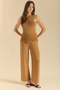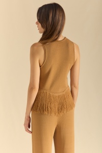 Top de punto halter con cuello redondo en tubular. Bajo en forma de onda con flecos de la misma materia.