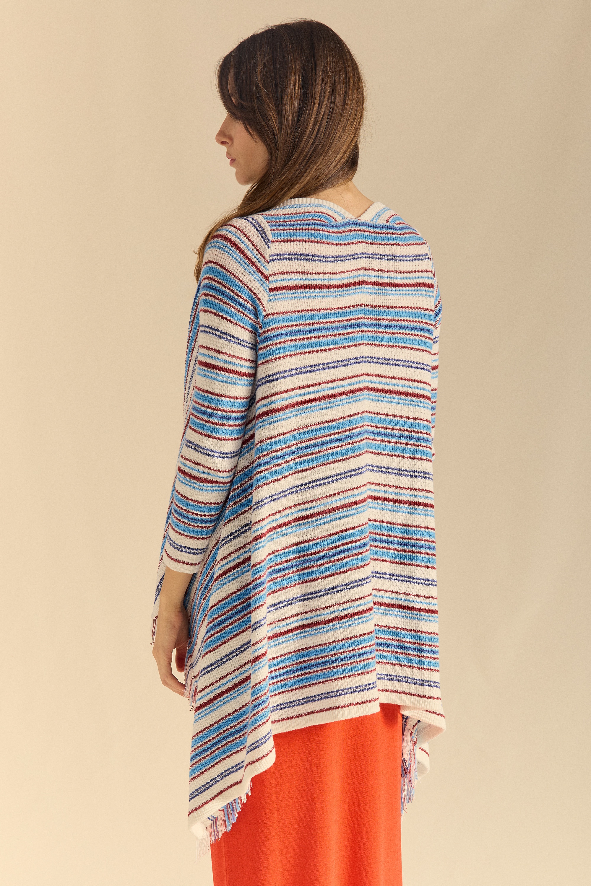 Chaqueta de punto con listado tramado en punto. Manga larga pegada, y patrón asimétrico, con delanteros que salen de la espalda y caen en pico, acabados en flecos de colores.