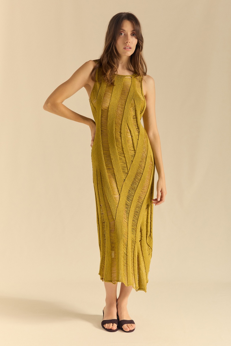 Vestido de punto desagujado con formas orgánicas que recuerdan a las ojas de las palmeras tropicales. Cuello redondo amplio, sin mangas y bajo asimétrico.