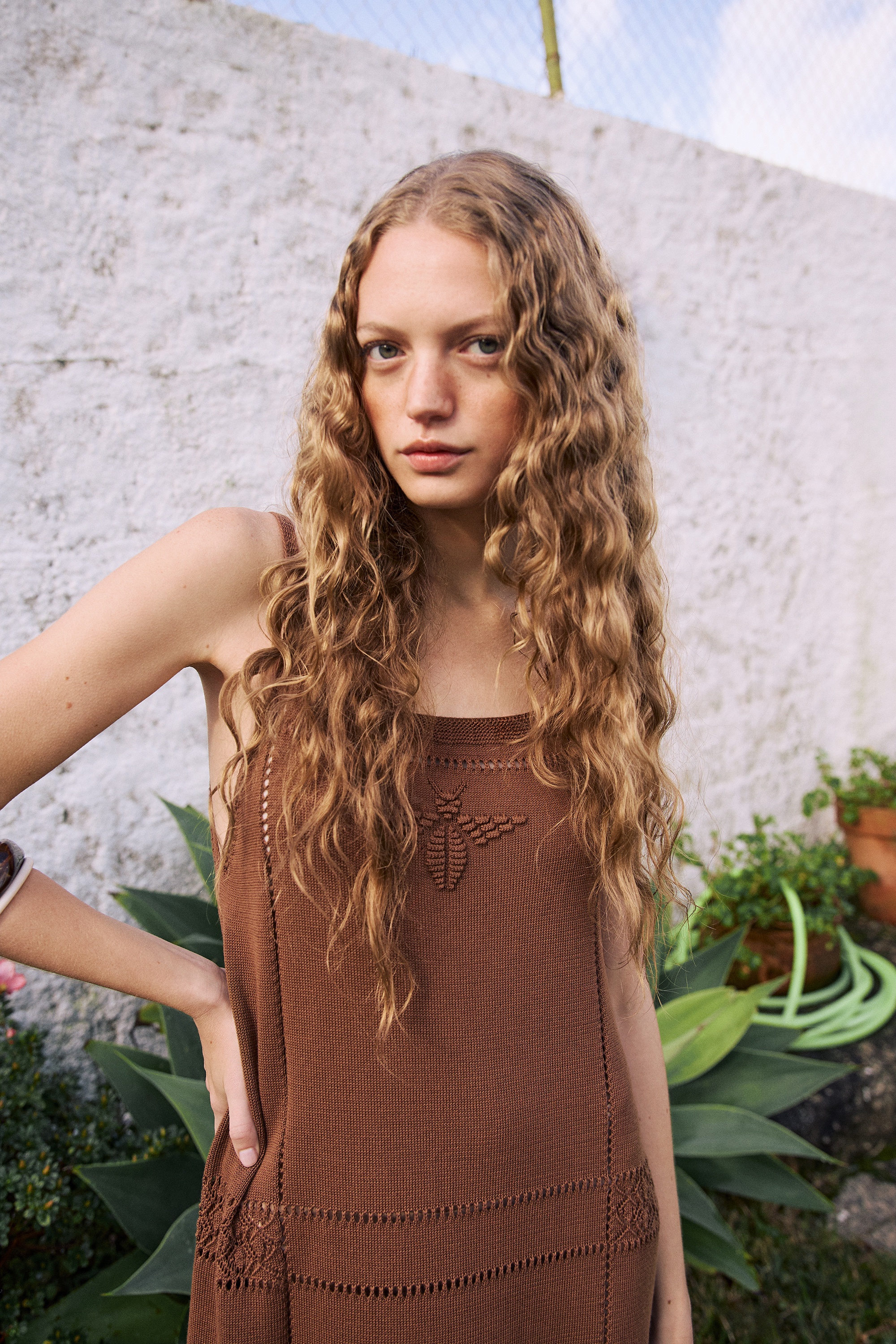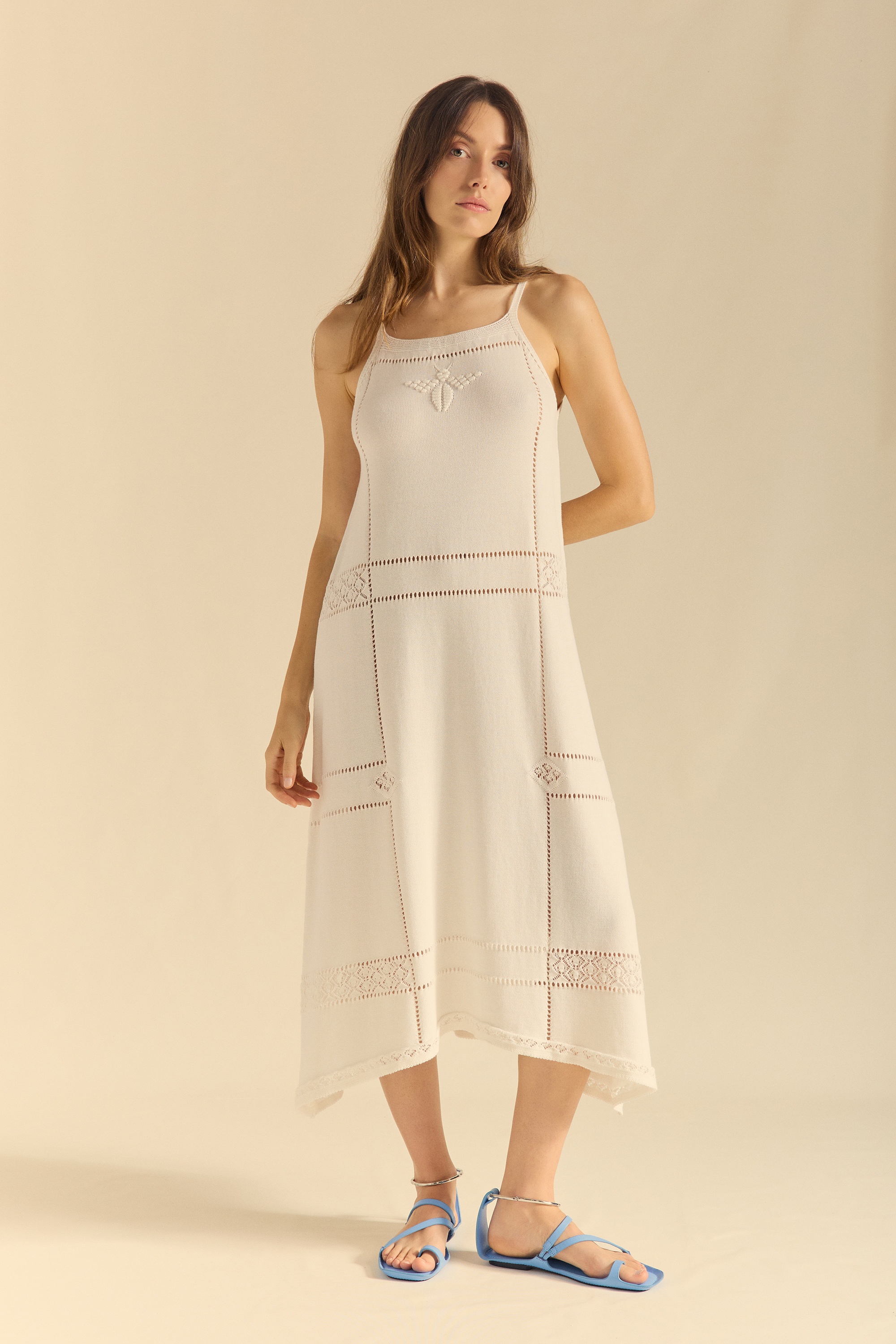 Vestido de punto de tirantes con escote y recto y patrón evasé desde el pecho. Detalle de calados a lo largo de la prenda y figura en forma de polilla cpmpuesta por bodoques.